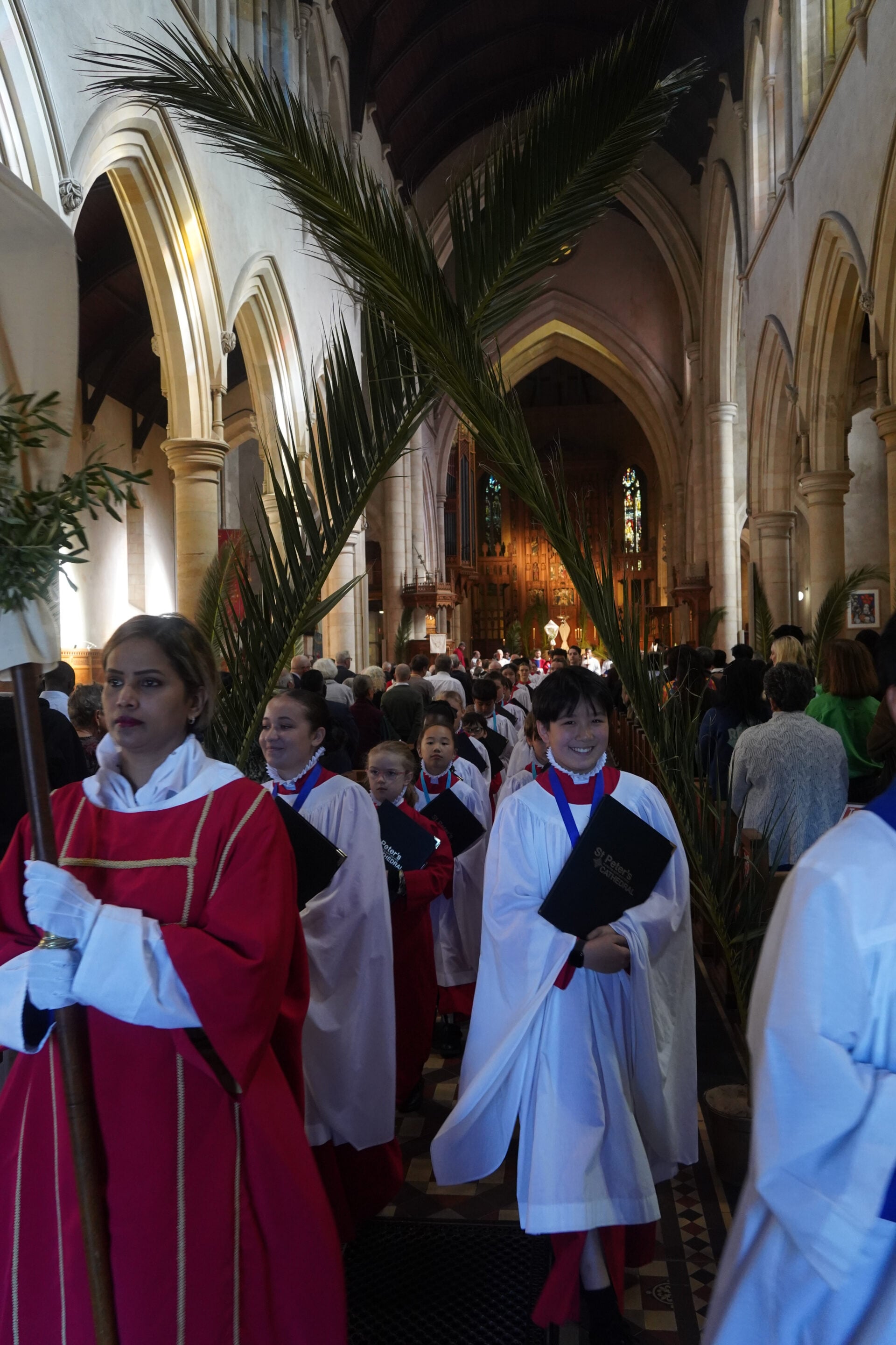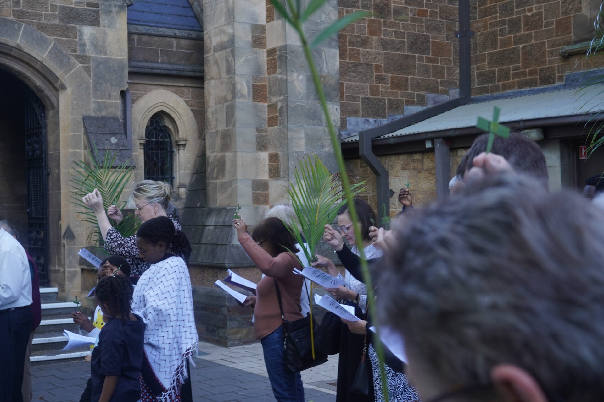 The Palm Sunday congregation assembled outside before processing along the street and through the cathedral doors, voices rising in song, palms waving in joyful, celebration.
