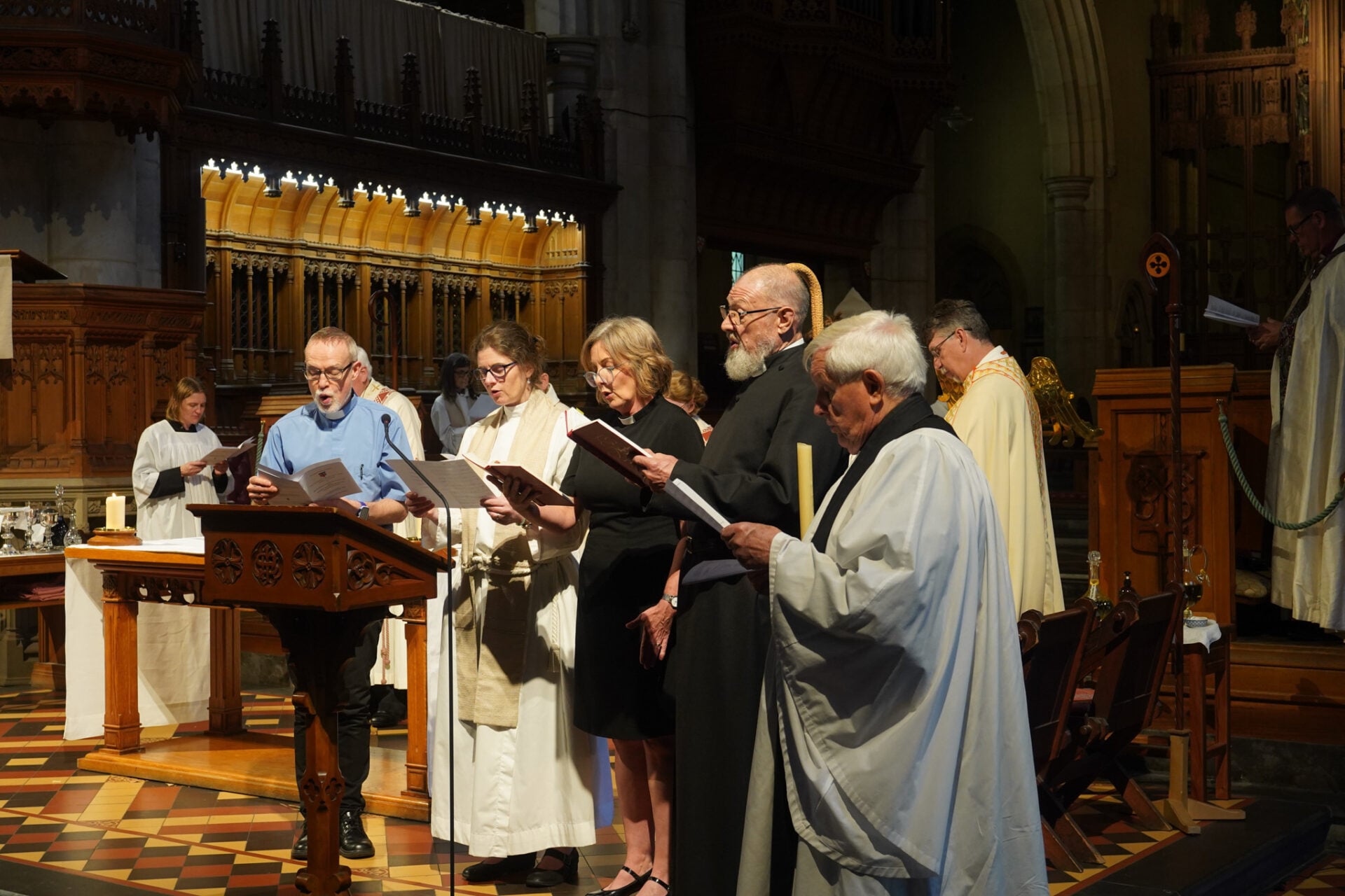 A gathering of clergy from across the diocese joined in the reaffirmation of vows, reading together from the liturgy in a moment of shared commitment that stretched across generations of ministry.
